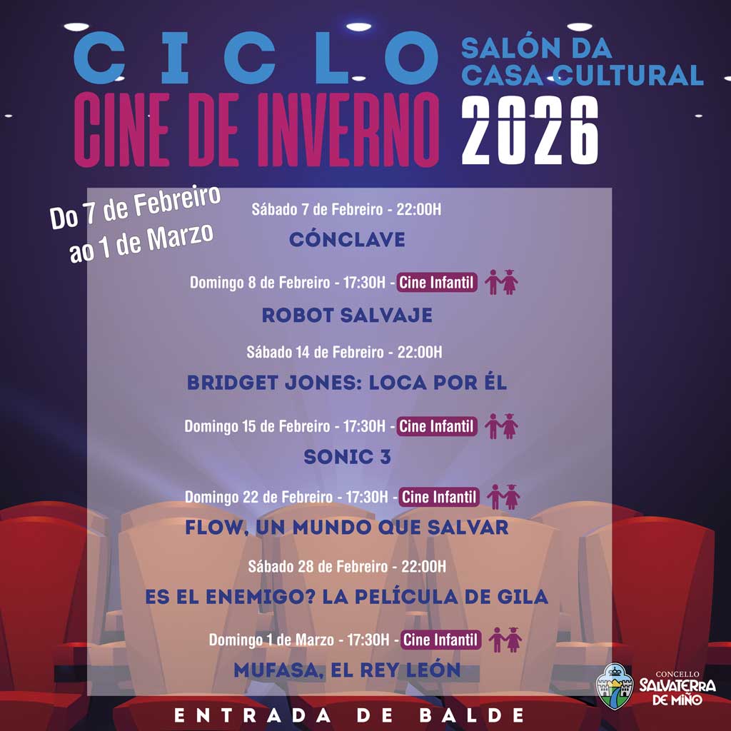 Dende a Concellería de Cultura preséntase a 6ª edición do Ciclo Cine de Inverno que se celebrará durante o vindeiro mes en Salvaterra de Miño.