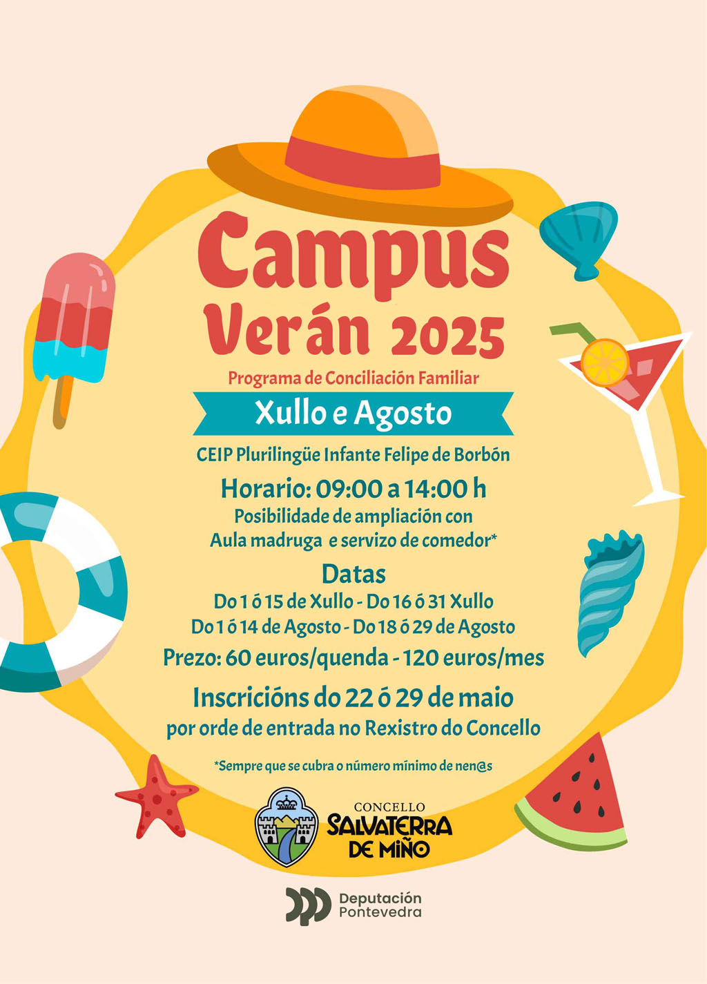 Achégase o remate do curso escolar e son moitas as familias que atopan grandes dificultades para conciliar a vida laboral e familiar. Por este motivo o Concello de Salvaterra de Miño, como ven facendo durante xa varios anos, realiza dentro do seu programa de conciliación o Campus de Verán, cofinanciado pola Deputación de Pontevedra. A actividade dirixida a nenos e nenas nados entre o 2021 e o 2013 realizarase durante os meses de xullo e agosto en horario de 09:00 a 14:00 h no C.E.I.P Plurilingüe Infante Felipe de Borbón. O Concello pon a disposición dos seus veciños máis de 200 prazas en catro quendas, nos meses de xullo e agosto. Ademais haberá a posibilidade de ampliar horario para as familias que así o precisen, coa aula matinal dende as 7:30h e servizo de comedor ata as 16:00h. Esta actividade require inscrición previa, terase en conta a orde de entrada por rexistro e terán prioridade aquelas familias que os pais e nais traballen nese horario e tamén as familias monoparentais. As bases e inscrición poderá recollerse no Concello ou descargarse a través da web concellodesalvaterra.com. O prazo de inscrición será do 22 ao 29 de maio e poderase facer dende a sede electrónica ou de xeito presencial en horario de 09:00 a 14:00 horas. Máis información no teléfono 986 658 082 ou na web do Concello.