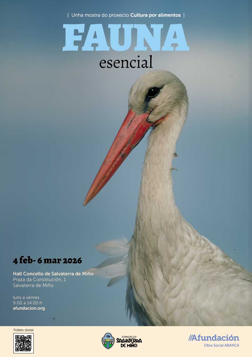 O Concello de Salvaterra de Miño acollerá a partir do mércores 4 de febreiro a exposición fotográfica "Fauna esencial", unha viaxe pola beleza e a fraxilidade das especies máis representativas do noso medio natural. Todo grazas á colaboración entre o Concello de Salvaterra de Miño, ABANCA e Afundación.
