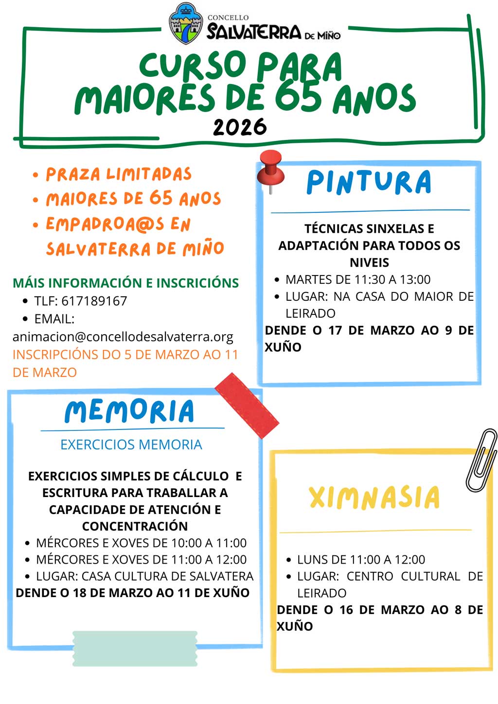 Os cursos están dirixidos a aquelas persoas que teñan máis de 65 anos empadroadas en Salvaterra de Miño e darán comezo en marzo e remantando no mes de xuño. As persoas interesadas poderán optar os seguintes cursos: MEMORIA os mércores e xoves de 10:00 a 11:00 e de 11:00 a 12:00 na Casa da Cultura de Salvaterra, PINTURA os martes de 11:30 a 13:00 na Casa do Maior de Leirado e XIMNASIA os luns de 11:00 a 12:00 no Centro Cultural de Leirado.